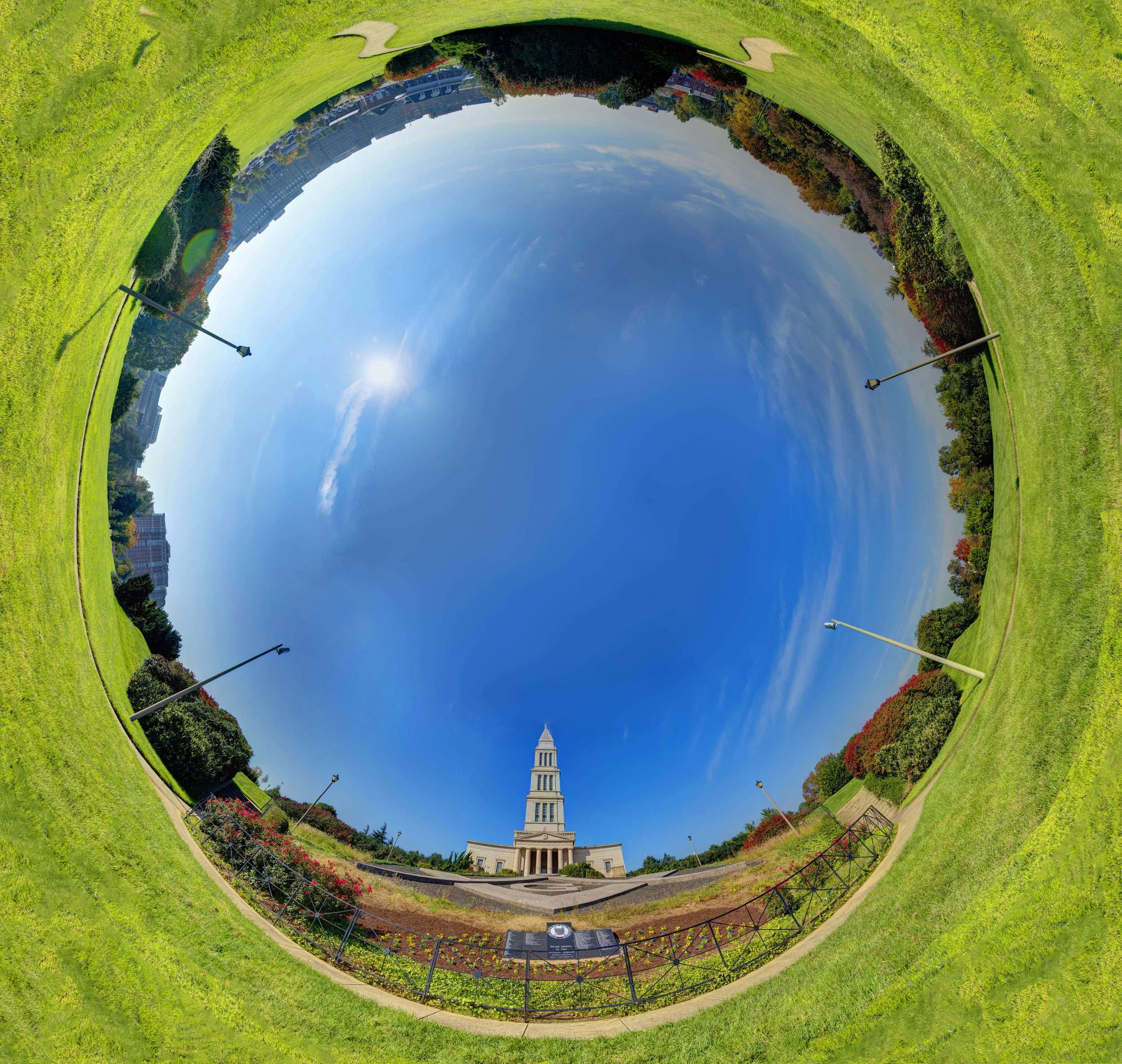 After getting over the fear of showing my work, my next step was to start experimenting in wide panoramas. I found that projecting the images in stereographic projections or "planets" was particularly interesting. I entered the following two images in a juried art show in April 2012. Much to my surprise, the brooding image of Alexandria City Hall won best in show! And, I sold my first piece of work!